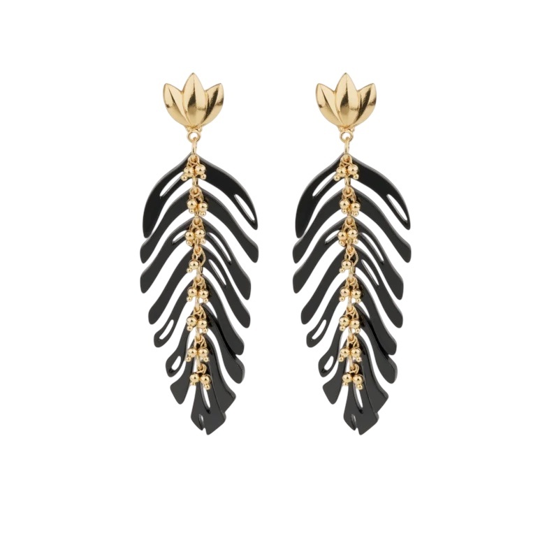 Goudvergulde oorbellen, opgebouwd uit fijn geslepen stukjes gekleurd acetaat, versierd met kraaltjes en gouden details.