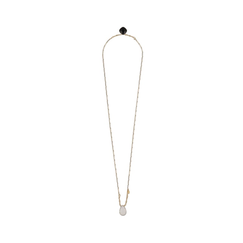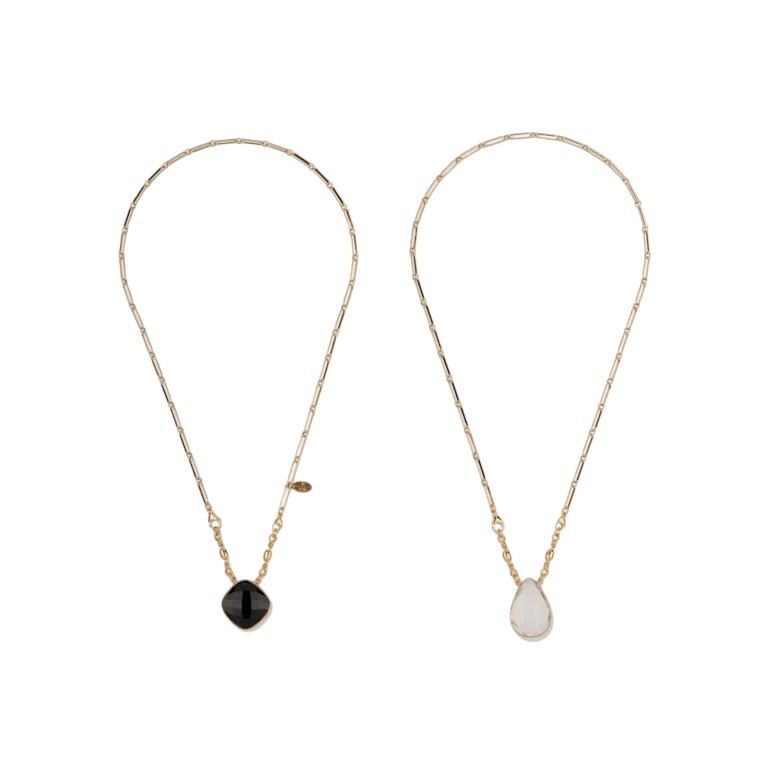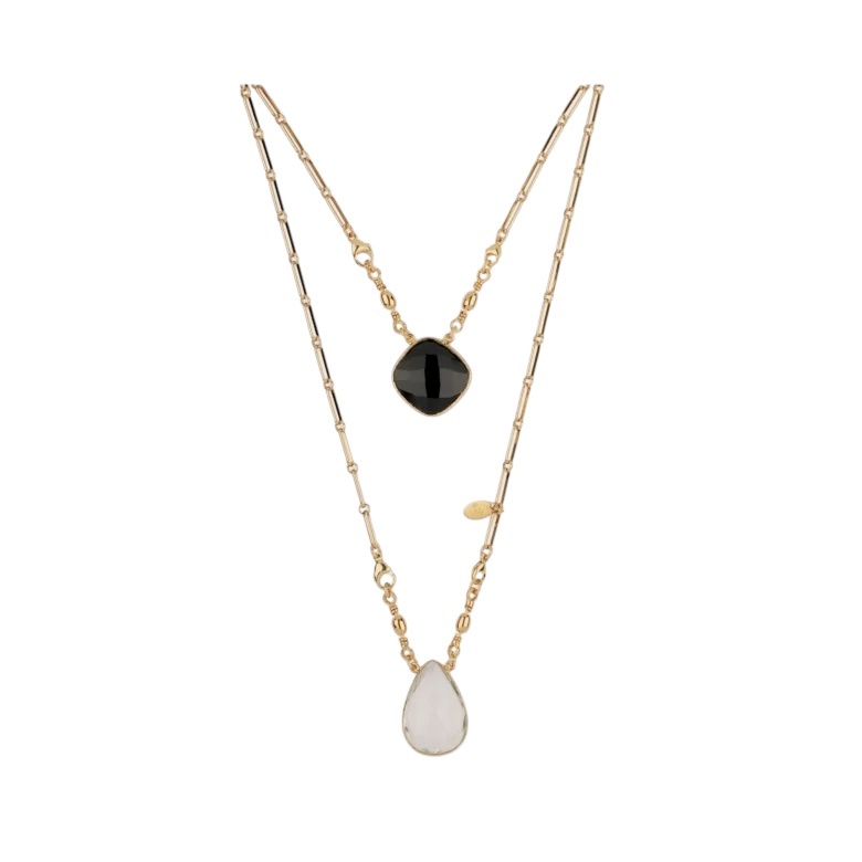 Goudvergulde ketting met twee stenen — Zwart Onyx en Kristal — gezet aan een fijne gouden ketting, afgewerkt met glaskraaltjes.